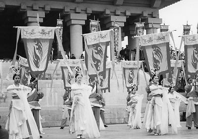 56面黃色儀仗旗在陽光下獵獵飄揚,有“太常”旗、“黃麾”旗,還有龍旗、門旗、日月旗、五星旗、風(fēng)雨旗、雷云旗、五岳旗、二十八宿旗和猛獸猛禽旗等,還有兵仗8對。最引人注目的是龍頭桿頂上高3米、寬兩米的“太!逼,旗面上繪有青色日月星辰、升龍降龍和祥云波濤。這是最高級別的儀仗旗。