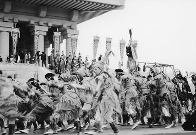 在此樂章中,各種道具將古老的巫舞和氏族的篝火舞相結(jié)合,服飾則采用了遠(yuǎn)古時期的巖畫、圖騰紋、甲骨文和象形寫意。12名扮鳳凰的少女、12名扮各種動物的男子和12名頭戴圖騰面具的“部落首領(lǐng)”,手持羽毛編織的鳳旗、花桿等飾物,手牽手,揮舞著鳥羽、獸尾、圖騰柱踏歌而舞……