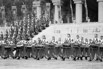 往年鳴放禮炮34響將改為“鳴鐘9響擊鼓34咚”(“9”是中華民族傳統(tǒng)最高禮數(shù),“34”代表全國34個省、市、自治區(qū)、特別行政區(qū))。所擊的一口2.73噸的金代大鐵鐘已在殿前懸架完畢。(韓宏)