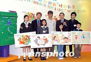 4月7日,香港郵政署發(fā)行《兒童郵票---我最喜愛的玩具和游戲》特別郵票,四位小小設(shè)計(jì)師共同展示其設(shè)計(jì)之新郵票樣本,并與郵政署長(zhǎng)蔣任宏、主禮嘉賓古巨基及贊助商于新郵票發(fā)行儀式上合照。