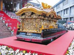 中新網(wǎng)4月15日電 臺(tái)灣的一家殯葬業(yè)者日前推出造價(jià)3600萬(wàn)元新臺(tái)幣的黃金宮殿靈車(chē),車(chē)體是加長(zhǎng)型的凱迪拉克,上方的宮殿、雕飾品都覆上金箔,租金一天10萬(wàn)元。據(jù)說(shuō)已有金融業(yè)及電子業(yè)名人家屬向業(yè)者詢(xún)問(wèn),打算為長(zhǎng)輩預(yù)訂黃金靈車(chē)。