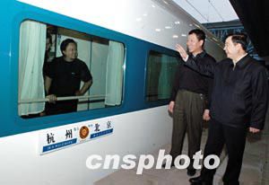 四月十七日晚,鐵道部副部長孫永福(右)和北京鐵路局負責(zé)人在北京火車站為中國鐵路第五次提速的首列提速車送行。中國鐵路第五次提速十七日晚開始,新開行的十九對直達特快列車中,北京開往杭州的Z9次,于十八點五十三分首發(fā)開始運行。中新社記者:王麗南