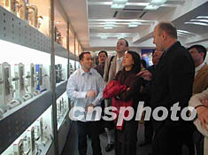 由法國巴黎圣但尼省維爾塔內市市長雅克·布萊爾先生等七人組成的“法國市長代表團”日前在溫州市甌海區(qū)考察其民營經濟,并尋求雙方經貿合作機會。圖為代表團參觀中國十大鎖王之一的“天宇鎖業(yè)”。作者:林丹