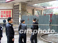 十九日,重慶天原化工總廠氯氣泄漏事故封鎖區(qū)一帶,警報已經(jīng)解除。但化工廠廠區(qū)內(nèi)仍未解除警戒。圖為大門前的警戒線。作者:鄒輝