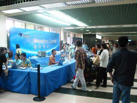 博鰲亞洲論壇2004年年會(huì)于4月24日在海南博鰲開(kāi)幕。本次論壇年會(huì)主題為“亞洲尋求共嬴——一個(gè)對(duì)世界開(kāi)放的亞洲”,表明2004年博鰲亞洲論壇年會(huì)將在全球背景下,探討亞洲各國(guó)和地區(qū)區(qū)域經(jīng)濟(jì)合作問(wèn)題,尋求亞洲共同進(jìn)步的有效途徑。圖為忙碌的?诿捞m機(jī)場(chǎng)博鰲亞洲論壇年會(huì)接待處。(春風(fēng))