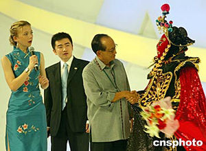 四月二十四日晚,博鰲亞洲論壇上演精彩的“亞洲文化”晚會,論壇理事長拉莫斯向中國“變臉”藝術(shù)家表示欽佩。中新社記者:鄭萍萍