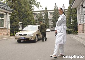 北京地壇醫(yī)院從四月二十二日收治新的“非典”患者后,正常門診病人數(shù)量顯著下降。四月二十五日,雖人車稀少,但在醫(yī)院大門口檢測體溫的劉淑敏女士依然堅(jiān)守崗位。中新社記者:鄒憲