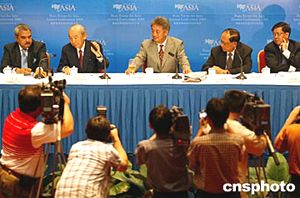 四月二十五日,龍永圖在博鰲亞洲論壇2004年會閉幕新聞發(fā)布會上表示,博鰲亞洲論壇將成為一個世界級論壇。拉莫斯(右二)、根本二郎(左二)等理事會成員出席了發(fā)布會。中新社記者:鄭萍萍