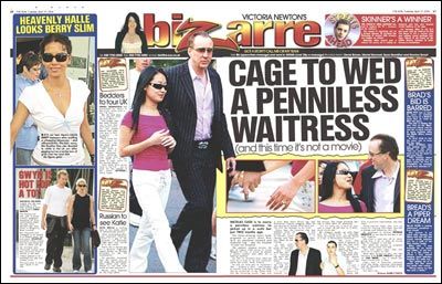 美國(guó)娛樂雜志《Bizarre》在最新一期中報(bào)道說:“尼古拉斯·凱奇將和身無分文的19歲餐廳服務(wù)生愛麗斯·金結(jié)婚。這不是電影,而是活生生的事實(shí)!