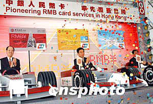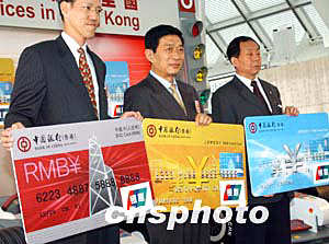 中國銀行(香港)有限公司四月二十九日在香港正式宣布,于四月三十日率先推出中銀人民幣卡系列,包括中銀人民幣信用卡和中銀卡(人民幣),設有普通卡和金卡,卡面印有"銀聯(lián)"標志,可用于“銀聯(lián)”遍布全國多個省市約40萬個商號網點。人民幣信用卡亦可用于香港貼有“銀聯(lián)”標志及香港地區(qū)的中銀香港、南洋商業(yè)銀行及集友銀行屬下的自動柜員機24小時提取人民幣或港幣的便利服務!爸秀y人民幣卡系列”啟動儀式。作者:錢興強