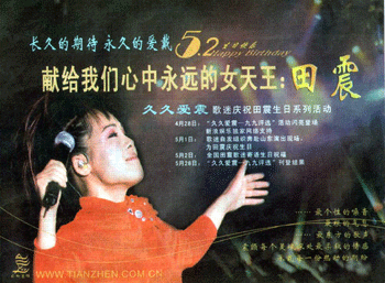 作為國內(nèi)首次歌迷自發(fā)集資為偶像購買生日廣告的發(fā)起者,田震歌迷會的會長張寧寧向記者介紹了他們的想法。“這是我們一年前的想法了,整個廣告也都是我們歌迷會的成員自己設(shè)計的。”對于田震近一兩年的低調(diào)表現(xiàn),始終擁護(hù)她的歌迷不甘心自己的偶像沒有音訊,因此他們決定在田震2004年生日到來的時候,用一系列的特別舉動,為偶像造勢!百I廣告位只是我們系列慶;顒又械囊豁(xiàng),我們還與門戶網(wǎng)站新浪合作,推出‘久久愛震-九九評選’活動,大家還要在5月1日自發(fā)趕赴田震當(dāng)天在山東聊城的演出現(xiàn)場高舉生日快樂的橫幅為她慶祝等!