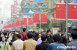 “五一黃金周”的第一天,上海街頭人頭攢動(dòng),鮮紅的國(guó)旗洋溢著濃濃的節(jié)日氣氛。作者:湯彥俊