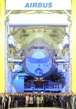 5月7日,在法國西南部城市圖盧茲空中客車公司總部,世界上最大的客機空客A380開始總裝。該公司稱,空客A380將于2005年首飛,2006年投入運營。