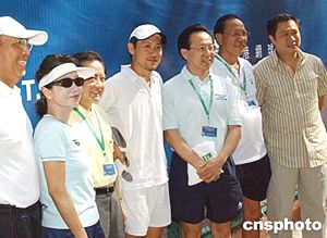 香港影視紅星張學友與著名音樂人區(qū)丁玉,五月九日代表香港明星隊參加在香港舉行的網球團體邀請賽網球雙打組合。