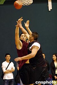 五月十一日,備戰(zhàn)雅典奧運(yùn)會(huì)的中國國家男子籃球隊(duì)在北京進(jìn)行公開訓(xùn)練,剛剛回國的NBA球員巴特爾參加了合練。中新社記者:盛佳鵬