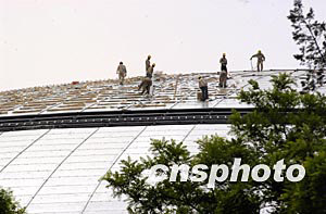 五月初,地處北京市中心的國家大劇院建筑工地上,建筑工人在雨季來臨前站在建筑穹體表層,加緊安裝金屬保護(hù)結(jié)構(gòu)。該建筑由國家財政投資三十億元興建,目前穹頂建筑施工是該建筑最具難度的施工項目之一。中新社記者:鄒憲