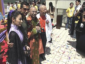 大型古裝荒誕電視劇《御前四寶》5月13日在北京市郊懷柔開機,臺灣女星鄭儀容,男星趙文卓,大陸著名主持人劉儀偉,香港老牌影星午馬(從左到右)出席開機儀式。中新社記者:高遠
