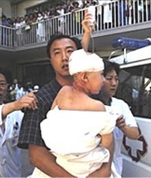 北京大學第一醫(yī)院幼兒園十五名兒童和三名教師二00四年八月四日上午九時左右在幼兒園被人持菜刀砍傷。其中一名重傷兒童經搶救無效死亡。犯罪嫌疑人是該幼兒園一名五十一歲的臨時工。北京警方透露,兇嫌有精神病史