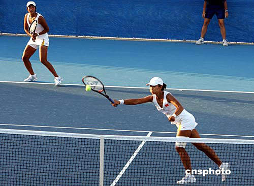 雅典當(dāng)?shù)貢r(shí)間8月20日傍晚,中國(guó)網(wǎng)球選手孫甜甜、李婷(前)在半決賽中以九比七戰(zhàn)勝阿根廷選手,歷史性地闖入奧運(yùn)會(huì)女子網(wǎng)球雙打決賽。中新社記者:任晨鳴