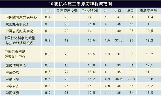 宏觀調(diào)控已經(jīng)取得明顯效果的說法得到了參與預(yù)測機構(gòu)比較一致的認(rèn)同,他們對三季度各項經(jīng)濟指標(biāo)的增長速度的預(yù)測明顯低于上半年,其中,對GDP增長預(yù)測的平均值為8.6%。