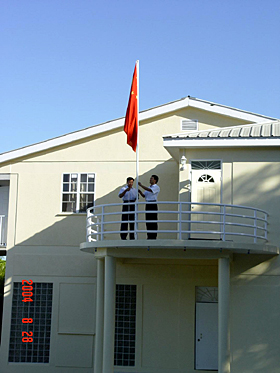 中新網(wǎng)8月30日電 據(jù)中國外交部網(wǎng)站消息:8月25日,中國駐多米尼克國大使館正式進駐大使館館舍。8月26日清晨,王新平臨時代辦和王勇三秘第一次在使館升起鮮艷的五星紅旗。