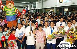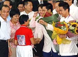 代表團今天中午返抵機場,雅典奧運贏得乒乓球男雙銀牌的高禮澤及李靜亦隨隊抵港,三百多名熱愛乒乓球的小朋友,獲安排到機場迎接,高禮澤及李靜的父母,以及民政事務(wù)局長何志平、康文署長王倩儀等官員,亦到機場迎接。