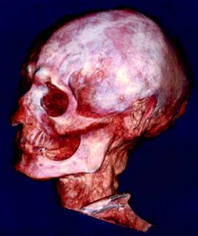 在實施木乃伊面容復(fù)原計劃時,由菲德瑞克博士領(lǐng)導(dǎo)的專家小組選中了一個3000歲的木乃伊。他生活在公元前945-前715年,生前是一個技術(shù)工人。該木乃伊于1900年在皇后谷地區(qū)被發(fā)掘出來,隨后又被送入埃及博物館!笆中g(shù)”過程中,科學(xué)家們把木乃伊置于掃描儀上,以平均每27.4秒顯示335幀圖像的速度進行掃描。所有的圖像都被存入電腦的記憶系統(tǒng)中,最后使用特殊軟件在電腦中將裹尸布揭去。隨后,科學(xué)家們根據(jù)圖像數(shù)據(jù),運用整形技術(shù)將頭骨復(fù)原。最后,他們以暴露在木乃伊裹尸布之外的面部皮膚和肌肉作為參照依據(jù),用特殊材料制作成面部肌肉、耳朵、嘴巴等。