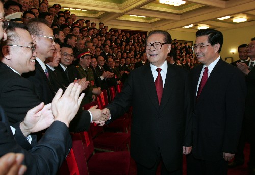 講話(huà)后,胡錦濤、江澤民親切握手,并向大家揮手致意,全場(chǎng)再次響起長(zhǎng)時(shí)間的熱烈掌聲。