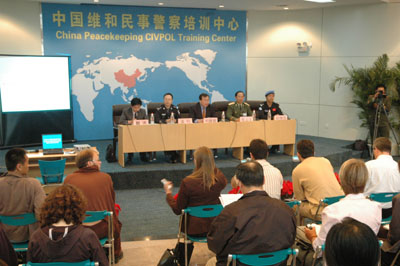 記者們首先參觀了新近落成的中國(guó)維和民事警察培訓(xùn)中心。公安部外事局維和處處長(zhǎng)談鈞在這里向記者介紹了中國(guó)參與聯(lián)合國(guó)維和行動(dòng)的有關(guān)情況。