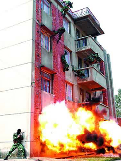 驚心動魄的反劫持人質(zhì)“戰(zhàn)斗”打響了!5名“恐怖分子”作案后,駕駛一輛面包車劫持3名“人質(zhì)”逃竄。特勤中隊接到上級命令后,立即兵分兩路,一路在各主要路口設(shè)障攔截,一路沿“歹徒”逃離方向?qū)嵤┳窊簟T谧咄稛o路的情況下,“歹徒”劫持“人質(zhì)”竄到某單位一辦公樓。在雙方對峙不下時,根據(jù)上級指示,特勤中隊采取強行突擊。說時遲,那時快,一聲巨響后,戰(zhàn)士們空中突降,從窗口魚躍而入,隨著幾聲槍響,“歹徒”們死的死,傷的傷,全被制服,3名“人質(zhì)”安然無恙,演練場內(nèi)再次掌聲如潮……