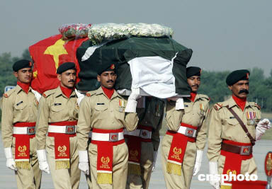 巴基斯坦政府16日派空軍專機(jī)運(yùn)送在人質(zhì)事件中遇難的中國(guó)工程師王鵬的遺體回中國(guó),專程從國(guó)內(nèi)趕來處理人質(zhì)事件善后事宜的中國(guó)政府工作組、中國(guó)駐巴使館領(lǐng)導(dǎo)以及巴方有關(guān)官員到機(jī)場(chǎng)向王鵬遺體告別。