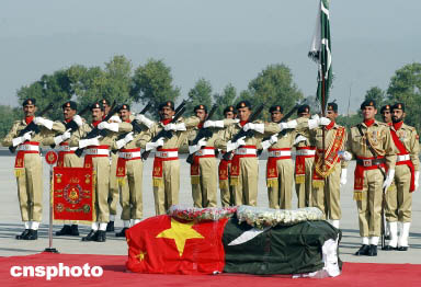 王鵬的靈柩上覆蓋著中巴兩國(guó)國(guó)旗,上面擺放著由鮮花組成的兩個(gè)花圈,在低沉悲涼的哀樂聲中,巴基斯坦陸軍儀仗隊(duì)為這位在人質(zhì)事件中遇難的中國(guó)朋友舉行了莊嚴(yán)肅穆的遺體告別儀式。6名巴基斯坦禮兵將靈柩慢慢抬起,沿著紅色的地毯,緩緩走向運(yùn)送遺體的專機(jī)。