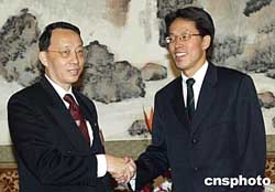 十月二十一日,國務(wù)院港澳辦副主任張曉明(右)在北京國賓館會見了由陳景生率領(lǐng)的香港大律師工會訪華團。作者:史利