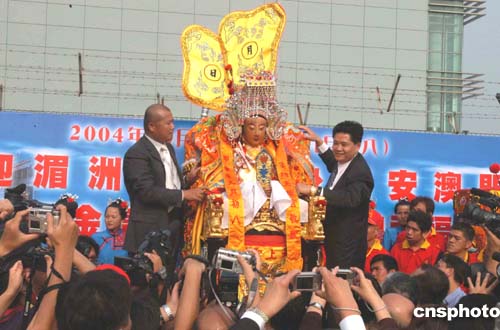 隨著媽祖金身的到來,以“媽祖金身巡安澳門盛典祈福”為主題的第二屆澳門媽祖文化旅游節(jié)也揭開了序幕。文化節(jié)開幕式將于明天上午舉行,隨后的幾天里,將舉行湄洲媽祖金身大巡游、閩澳旅游聯(lián)合促銷、天津民間藝術(shù)剪紙──媽祖故事展覽、媽祖緣.泉澳情書畫創(chuàng)作展、福建美食節(jié)和福建民俗文藝表演等活動。