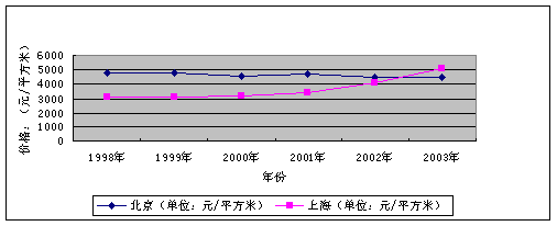 但從動態(tài)上看,商品房空置面積并沒有增加,而是呈下降趨勢。2004年8月底,商品房空置面積0.97億平方米,同比減少0.8%,比去年底減少3%。這說明當(dāng)前的房地產(chǎn)空置問題并未惡化。我們認(rèn)為,對于房地產(chǎn)空置現(xiàn)象,必須從兩個方面認(rèn)識:一方面,房地產(chǎn)空置占壓大量資金,其中部分形成不良資產(chǎn);另一方面,一定規(guī)模的空置對正常的房地產(chǎn)市場是完全必要的,它實(shí)際上在某種意義上是一種“庫存”,從而發(fā)揮平抑房價的作用。從圖3的對比可以看出,上海市近幾年房地產(chǎn)供銷兩旺,不僅沒有出現(xiàn)大量空置,連部分以前積壓的房子也賣出去了,而房價表現(xiàn)為一路飆升;北京市則房價比較穩(wěn)定,甚至穩(wěn)中有降,其中房地產(chǎn)空置對房價上升起到的抑制作用不可忽視。