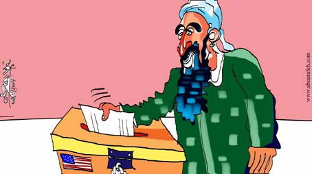 中新網(wǎng)11月1日電 10月29日晚,銷聲匿跡一年多的本拉登,在美國大選投票日來臨的前四天突然拋頭露面了。在半島電視臺播放了本拉登講話的錄像帶之后,分析家一致認為拉登此次露面是為了給美國大選施加影響,試圖影響美國大選的最終結(jié)果。半島電視臺網(wǎng)站于今日發(fā)表了一幅漫畫,在這幅漫畫當(dāng)中,本拉登被描繪成一個重量級選民,他的講話被戲稱作是在為美國總統(tǒng)大選提前投票。(章田)