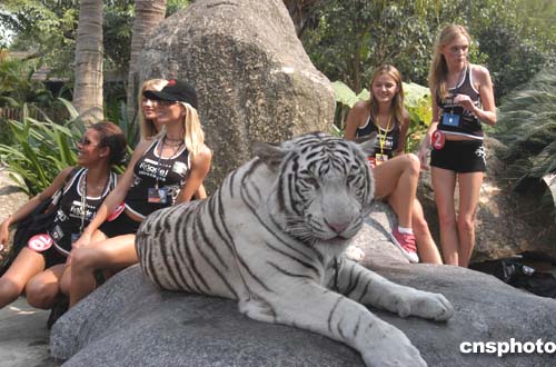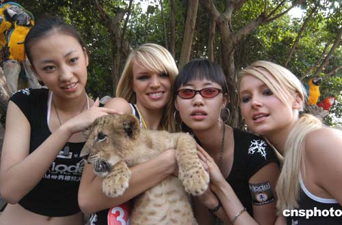 二零零四星際世界模特大賽全球總決賽入圍的五十多名選手,十一月二日首次亮相廣州長隆夜間動物世界進行形體展示和外景拍攝。作者:劉衛(wèi)勇