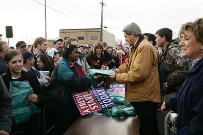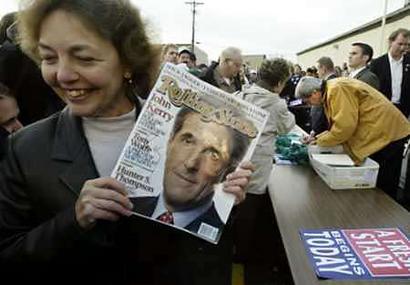 圖為2日當(dāng)天克里在威斯康星州分發(fā)競(jìng)選宣傳材料的一個(gè)場(chǎng)景,克里的一名女支持者手里拿著的雜志,是民主黨總統(tǒng)候選人克里簽過名了的一本競(jìng)選宣傳資料。(固山)