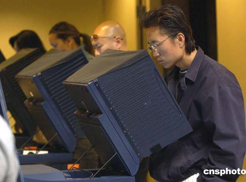 二○○四年大選中已經(jīng)全面引用先進(jìn)的電腦屏觸式投票機(jī)進(jìn)行選舉。但仍有選民偏愛紙票。圖為美西時(shí)間十一月二日上午,選民把選票投進(jìn)型似藍(lán)布旅行包的大選票箱的情景。作者:陳鋼