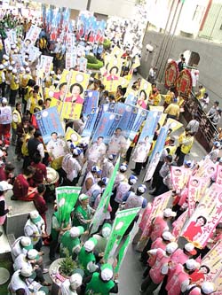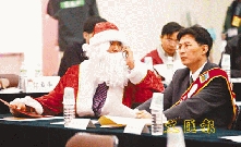 53位臺(tái)北縣“立委”參選人17日上午齊聚體育場(chǎng)進(jìn)行號(hào)次抽簽,為了搶鏡頭,各出奇招,有人扮成媽祖、還有人扮成了包青天、圣誕老人。支持者在現(xiàn)場(chǎng)揮舞旗幟、高舉活動(dòng)招牌,大喊“當(dāng)選”。