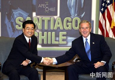 中新網(wǎng)圣地亞哥11月20日電 (記者王丹鷹)11月20日,胡錦濤主席在智利首都圣地亞哥市出席亞太經(jīng)合組織非正式領(lǐng)導(dǎo)人會(huì)議期間會(huì)見(jiàn)了美國(guó)總統(tǒng)布什。兩國(guó)元首就中美關(guān)系、臺(tái)灣問(wèn)題等交換了意見(jiàn)。