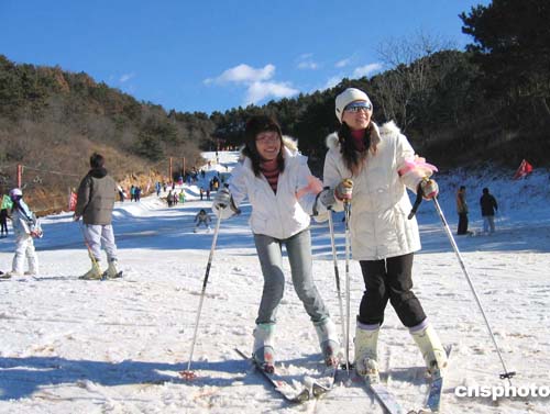 | 一場(chǎng)清風(fēng)吹散了持續(xù)三日的大霧,北京十二月四日迎來(lái)了藍(lán)天白云的好天氣。許多北京市民紛紛涌至郊區(qū)滑雪場(chǎng)放飛心情。僅北京密云云佛山滑雪場(chǎng)就迎來(lái)了上萬(wàn)名滑雪愛(ài)好者。圖為兩名女青年在滑雪場(chǎng)盡情嬉戲。作者:吳慶才