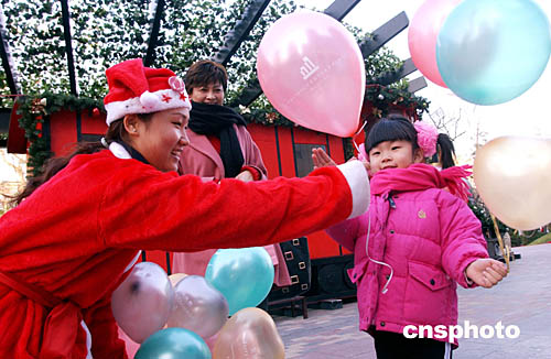 十二月五日,北京一家商場把公司員工打扮成圣誕老人的模樣為過往顧客派發(fā)圣誕禮品和氣球,以此招徠顧客。作者:韓藝冰