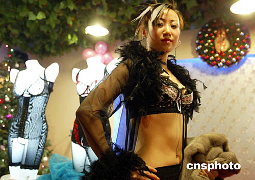 十二月二十五日圣誕節(jié),在北京寶兒金領(lǐng)生活館,一場別開生面的臺灣薇尼喬二零零五年新款內(nèi)衣秀為許多白領(lǐng)女性增添了生活樂趣。中新社記者:任海霞