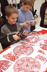 十二月二十六日,北京民間藝術(shù)展正在中華世紀(jì)壇舉行,風(fēng)箏、泥塑、面塑、毛猴、剪紙、蛋雕、京劇臉譜等二十多個(gè)藝術(shù)門類的二百八十件民間工藝品與觀眾見(jiàn)面。作者:韓藝冰