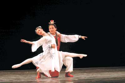 趙明:從結(jié)構(gòu)上講,我用了四段三人舞來展現(xiàn),愛情的發(fā)生、發(fā)展、高潮、幻滅的悲劇過程!都t樓夢》是民族經(jīng)典,是中華民族的藝術(shù)瑰寶,她的包容性極強。因此,舞蹈也應有強烈的民族特點。在群舞中我運用了富有中國民間舞特點的手絹舞、扇子舞、水袖舞等,讓人一看就知道這是中國舞劇。