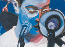 竇唯還特別喜歡用畫(huà)描繪自己樂(lè)隊(duì)演出時(shí)的景象,在昨日曝光的作品中就有兩幅。從畫(huà)面上看,一組搖滾樂(lè)隊(duì)正在舞臺(tái)上盡情揮灑激情,而臺(tái)下的觀眾也投入欣賞。另外一幅自畫(huà)像更是惹眼,藍(lán)色是畫(huà)的基調(diào),畫(huà)中的竇唯掩在兩只話筒后面,低頭正沉醉地低唱著。總的看來(lái),竇唯的小畫(huà)未必惹眼但很精妙。不賣不展
