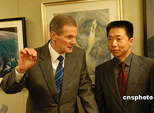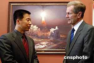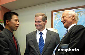 中國首位進(jìn)入太空飛行的宇航員楊利偉今天下午在華盛頓會晤美國上世紀(jì)八十年代的宇航員、現(xiàn)在的國會參議員比爾·納爾遜。