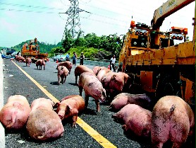 據(jù)臺(tái)灣媒體報(bào)道,一大清早一輛載豬的貨車在南二高嘉義路段突然爆胎翻覆,5、60只豬全被摔出來(lái),有些豬受傷流血,有些嚇得直撒尿,不過(guò)大部份的豬生龍活虎跑到馬路上透氣,搗亂了高速公路上的交通。附近民眾看不下去,自動(dòng)上來(lái)幫忙趕豬。