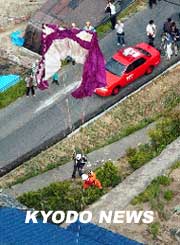 中新網(wǎng)5月27日電 日本當(dāng)?shù)貢r(shí)間26日下午1時(shí)許,由一名23歲女性駕駛的滑翔傘在日本廣島縣尾道市吉和町被距離地面約30米的高壓電線所絆,并被懸在半空中。
